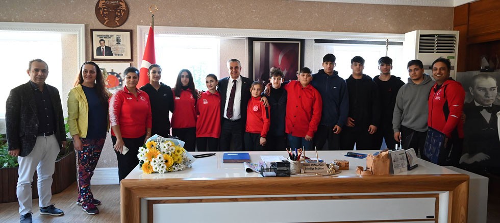 Uşak’ta yapılan liselerarası Judo Şampiyonası yarı finallerde dereceye giren Kemerli judocular Kemer Belediye Başkanı Necati Topaloğlu’nu ziyaret etti.