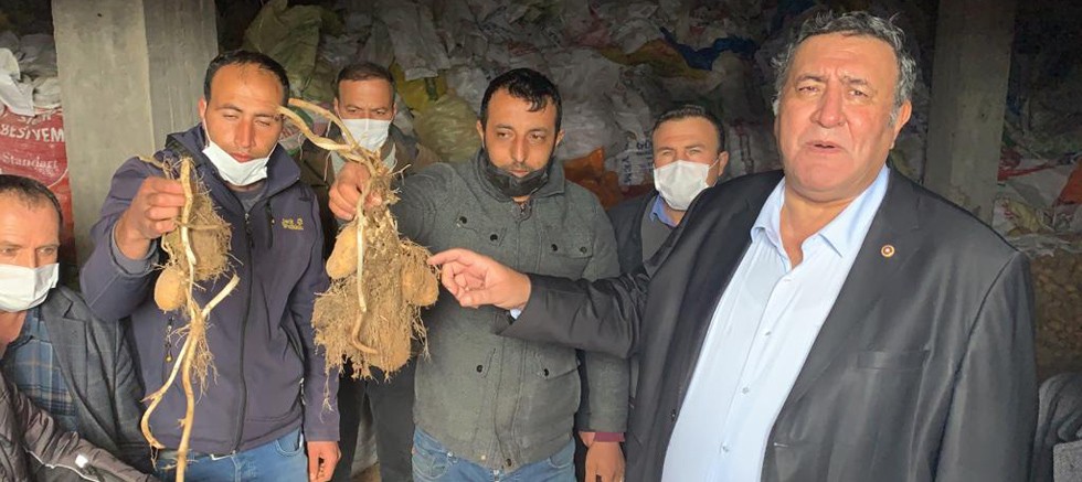 Kilogramını 1 liraya mal ettiği patatesi 50-60 kuruşa bile satamayan üreticiler, CHP Milletvekili Ömer Fethi Gürer’e dert yandı. Pandemi koşullarına rağmen, Cumhurbaşkanı Recep Tayyip Erdoğan’ın ‘her karış toprağı ekin’ çağrısına uyarak, üretim yaptıklarını belirten çiftçiler, “Biz her türlü zorluğa rağmen, girdi maliyetlerindeki artışı ve ekonomik krizleri de görmezden gelerek üretim yaptık. Gübre, mazot, tohum, ilaç, sulamada kullandığımız elektrik ve diğer girdi maliyetleri geçen yıla göre yarı yarıya artış gösterdi. Ancak biz şimdi ürünümüzü maliyetine bile satamıyoruz. Ürünlerimiz depoda çürümeyi bekliyor. Bize ‘her karış toprağı ekin’ diyen Cumhurbaşkanına sesimizi duyuramıyoruz. Aylardır yalvarıyoruz, sorunumuza bir çözüm yolu bulunmasını istiyoruz ama ne yazık ki bizim sesimizi duyan yok” diye konuştular.