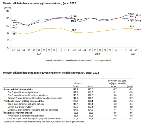 Türkiye İstatistik Kurumu (TÜİK), 2023 Şubat'a ilişkin Hizmet, Perakende Ticaret ve İnşaat Güven Endekslerini açıkladı. Ülkemizde güven endeksi hizmet, perakende ticaret ve inşaat sektörlerinde düştü.