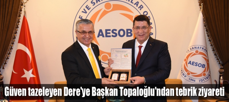 Başkan Topaloğlu, yaptığı açıklamada, "Antalya Büfeciler Odası seçiminde güven tazeleyen AESOB Başkanı Adlıhan Dere'yi tebrik ediyorum. Kendisi her zaman esnafın yanında olmuştur ve olmaya da devam ediyor. Esnafa yönelik güzel çalışmalarını ve projelerini yakından takip ediyoruz. Sayın Başkan Adlıhan Dere'yi tebrik ediyor, bundan sonraki görevinde ve çalışmalarında başarılar diliyorum." diye konuştu.