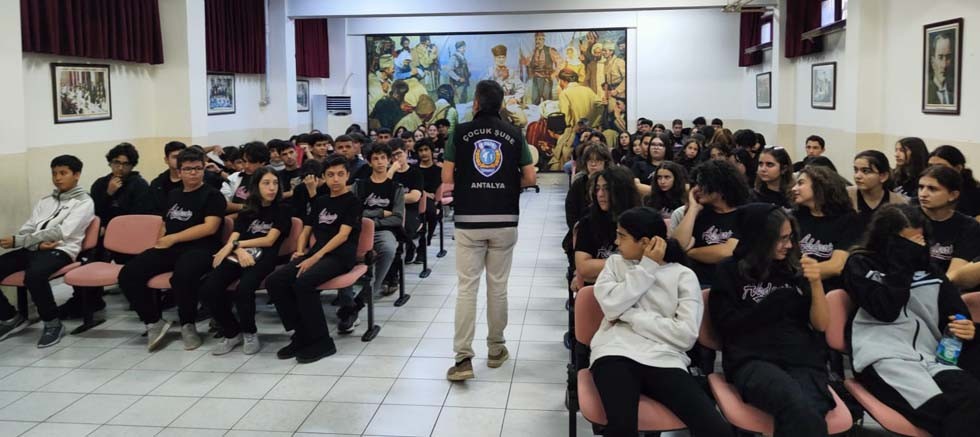 Emniyet müdürlüğümüzde görevli alanında uzman personel tarafından, Konyaaltı ilçesinde bulunan Akdeniz Anadolu Lisesi, Alanya ilçesinde bulunan Nimet Alaettinoğlu Anadolu Lisesi, Rıfat Azakoğlu Mesleki ve Teknik Anadolu Lisesi, Sugözü Cemal Coşkun Ortaokulu, Kemal Şuberi İlkokulu, Kaş ilçesinde bulunan Ova Ortaokulu ziyaret edilerek toplam 550 öğrenciye,