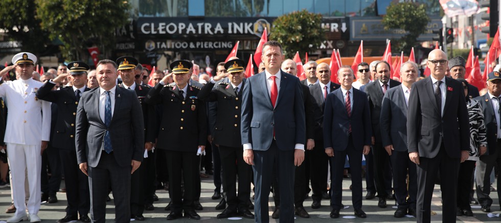 Alanya’da Cumhuriyetin 100. yıl dönümü kutlama etkinlikleri kapsamında Hükümet Meydanı’ndaki Atatürk Anıtı önünde çelenk sunma töreni düzenlendi. Törene Alanya Kaymakamı Fatih Ürkmezer, Alanya Belediye Başkanı Adem Murat Yücel, Alanya Cumhuriyet Başsavcısı Celal Tekin, kamu kurum ve kuruluşlarının temsilcileri, oda, dernek başkanları, siyasiler,muhtarlar ve vatandaşlar katıldı. Kaymakamlık ve belediye başkanlığının çelenk sunumu ve saygı duruşuyla başlayan tören, İstiklal Marşı’nın okunmasıyla sona erdi.