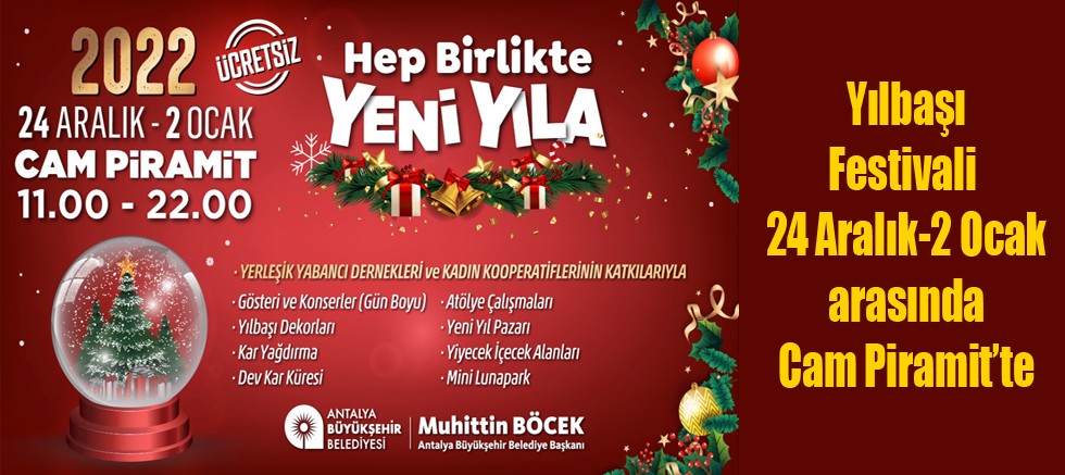 Antalya Büyükşehir Belediyesi, 24 Aralık- 2 Ocak tarihleri arasında Cam Piramit’te Yılbaşı Festivali düzenliyor. Antalya’da yaşayan yerleşik yabancı dernekler ve kadın kooperatiflerinin katkısı ile düzenlenen festivalde kültürler tanıtılacak.