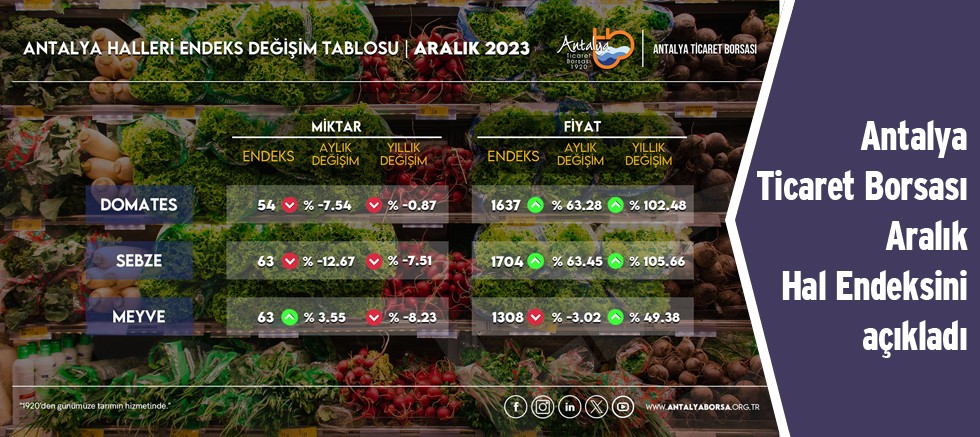 Antalya hallerinde işlem gören domates, sebze ve meyvelerin işlem miktar ve fiyatlarıyla ilgili endeks değerleri, 2023 Aralık ayında bir önceki aya göre ve geçen yılın aynı ayına göre aşağıda verilen tablodaki gibi değişti: