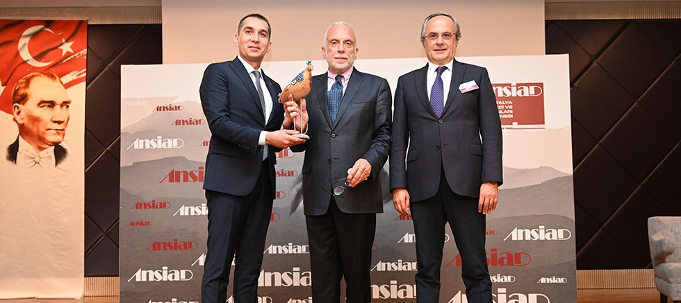 "ANSİAD 6. Olağan Toplantısı” ANSİAD Yönetim Kurulu Başkanı Ercan Özbek’in toplantının başkanlığını yapan ANSİAD Geçmiş Dönem Başkanı & TÜRKONFED Başkan Yardımcısı Ali Eroğlu ile birlikte konuk konuşmacı Soli Özel’e günün anısına Antalyalı Seramik Sanatçısı Tufan Dağıstanlı’nın seramik kuşlarından birisini hediye etmesinin ardından sona erdi.