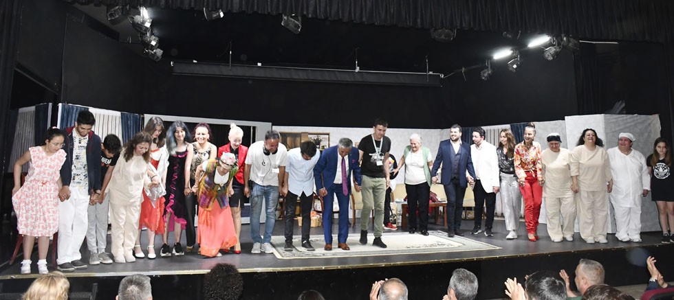 Oyun sonrası Başkan Topaloğlu oyuncuları tek tek tebrik ederek, Emine Öney’e çiçek verdi.