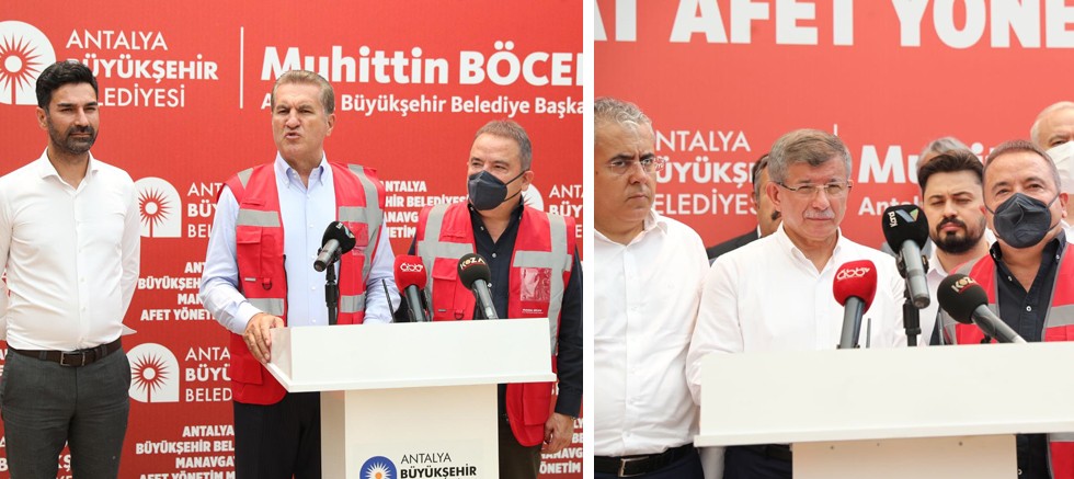 Antalya Büyükşehir Belediyesi Manavgat Afet Yönetim Merkezini ziyaret ederek, Başkan Böcek’ten çalışmalar hakkında bilgi alan Türkiye Değişim Partisi Genel Başkanı Mustafa Sarıgül ve Gelecek Partisi Genel Başkanı Ahmet Davutoğlu yangının bir an önce söndürülmesi için birlik ve beraberliğe ihtiyaç olduğunu söyledi.