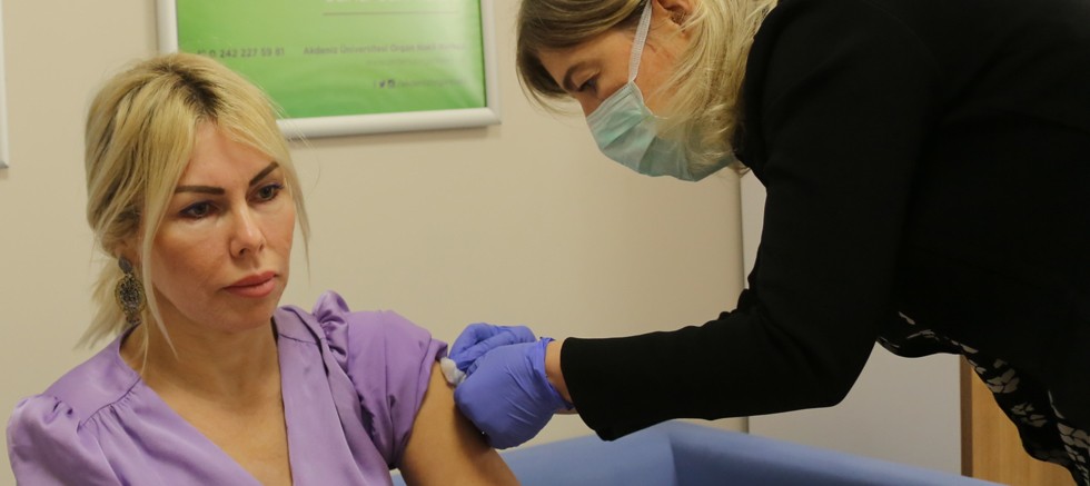Akdeniz Üniversitesi Hastanesi’nde koronavirüse yönelik Çin’e ait inaktif aşının Faz 3 çalışmalarına devam ediliyor. Akdeniz Üniversitesi’nde aşı için ilk gönüllü olan Akdeniz Üniversitesi Rektörü Prof. Dr. Özlenen Özkan’a ikinci doz bugün yapıldı.