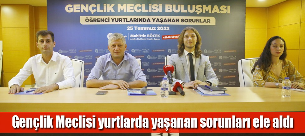 Antalya Büyükşehir Belediyesi Gençlik Meclisi, öğrenci yurtlarında yaşanan sıkıntıları ele almak için toplandı. Toplantıya Büyükşehir Belediyesi Genel Sekreter Yardımcısı Durmuş Ali Arslan, Gençlik Meclisi Üyeleri, siyasi partilerin gençlik kolları üyeleri katıldı.