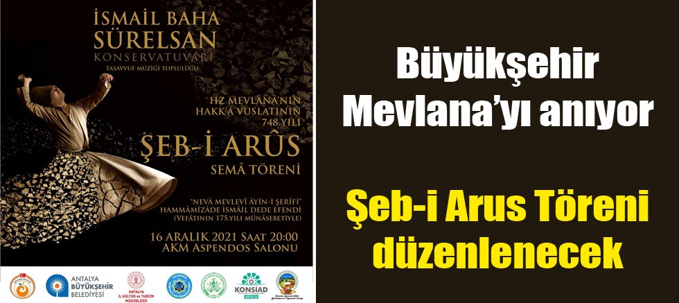 Antalya Büyükşehir Belediyesi, Hz. Mevlana’nın Hakk’a vuslatının 748’inci yılını Şeb-i Arus töreni ile anacak. 16 Aralık Perşembe saat 20.00’de AKM’de düzenlenecek törene tüm Antalyalılar davetli.