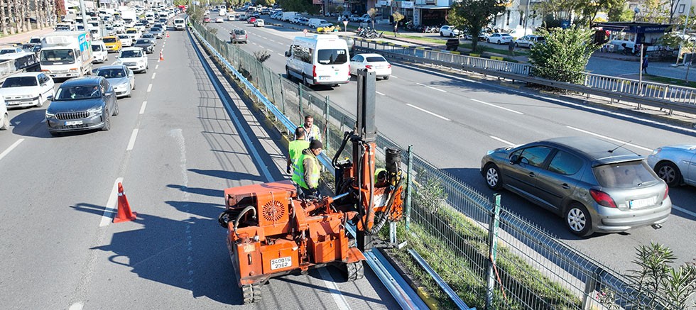 Gazi Bulvarı’nda yürütülen çalışmalar kapsamında Antalya Büyükşehir Belediyesi Fen İşleri Dairesi Başkanlığı ekipleri, bulvarı kullanan sürücü ve yayaların güvenliğini artırmayı hedefliyor. Çalışmalar doğrultusunda otokorkuluk direklerinin zemine sabitlenmesi için hidrolik kazık çakma makinesi kullanılıyor. Makineyle önce çelik kazıklar refüj hattına çakılıyor, ardından montajı tamamlanan korkuluklarla birlikte refüj düzenleme çalışmaları yapılıyor. Çalışmalar süresince trafik akışı kontrollü olarak sağlanırken, yolun sol şeridi trafiğe kapatılarak geçişler orta ve sağ şeritten gerçekleştiriliyor.
