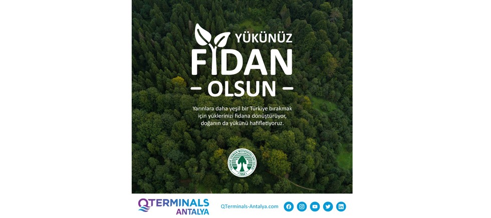 Çevreyi koruyan faaliyetler yürütmeyi ilke edinen QTerminals Antalya, erozyonla mücadele ve orman varlığının artırılması için Orman Mühendisleri Odası iş birliğinde Antalya Konyaaltı’nda hatıra ormanı oluşturma çalışmalarına devam ediyor. ‘QTerminals Antalya Hatıra Ormanı’ projesi kapsamında aylık olarak en çok tonajda yük taşıyan müşteriler adına fidan dikimi yapılıyor.