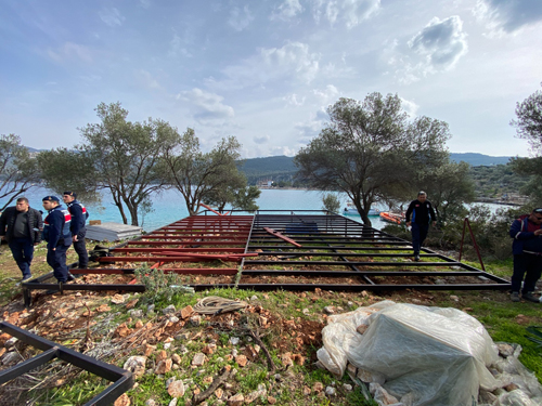 “İlçemizin gözde turizm noktalarından olan Liman ağzı bölgesinde sit alanına bungolov amacıyla yapımına başlanan 13 adet demir profilden yapılmış temel, belediyemizce müdahale edilerek yıkımı gerçekleştirilmiştir. Belediye olarak kaçak yapılar ile ilgili mücadelemiz devam etmektedir. Liman ağzına ulaşımın olmamasından dolayı yapıların malzemesi tekneler ile çekilerek yapılmıştır”.