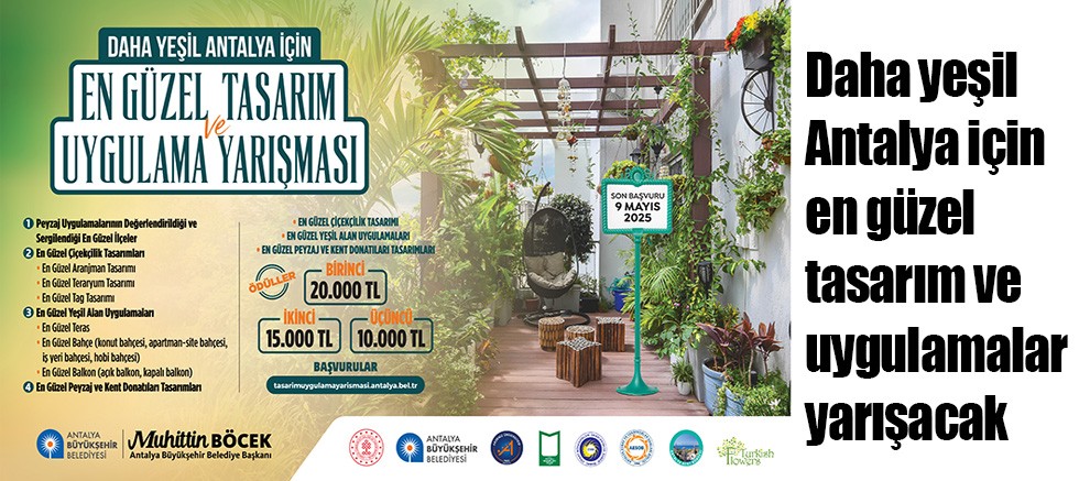 Antalya Büyükşehir Belediyesi tarafından, çevre bilincini, ve çevre sevgisini arttırmak, yaşanılan çevrenin görsel niteliğini desteklemek amacıyla düzenlenen “Daha Yeşil Antalya İçin En Güzel Tasarım ve Uygulama Yarışması” için geri sayım başladı. Yarışma ile halkın çevre düzenleme ve kent peyzajına yönelik ilgisini teşvik etmek, yenilikçi tasarımları desteklemek ve iklim değişikliğine karşı dikkat çekmek amaçlanıyor.