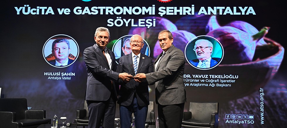 Antalya Ticaret ve Sanayi Odası (ATSO) ev sahipliğinde düzenlenen “YÜciTA ve Gastronomi Şehri Antalya” başlıklı söyleşi programının konuğu olan Antalya Valisi Hulusi Şahin, gastronomi alanında yaptığı değerli katkılardan dolayı YÜciTA Başkanı Prof. Dr. Yavuz Tekelioğlu’na ödülünü takdim etti.