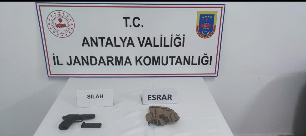 "Gazipaşa Cumhuriyet Başsavcılığının koordinesinde; Gazipaşa ilçesi Güney Jandarma Karakol Komutanlığı önü Yol Kontrol Noktasında 33 ×× ××9 plakalı araçta yapılan kimlik kontrolünde şüpheli hareketlerde bulunan A.Ü. isimli şahıs araçtan indirilerek yapılan aramada, ruhsatsız tabanca ve şarjör içerisinde 7 adet 7.65 mm fişek olduğu, araçta yolcu olarak bulunan M.Ş. isimli şahsın üst aramasında yaklaşık 3 Gr esrar maddesi taşıdığı tespit edilmiştir. Olay ile ilgili olarak Nöbetçi Cumhuriyet savcısına bilgi verilerek alınan talimatlar dogrultusunda 2 şüpheli hakkında adli işlemlere başlanılmıştır.