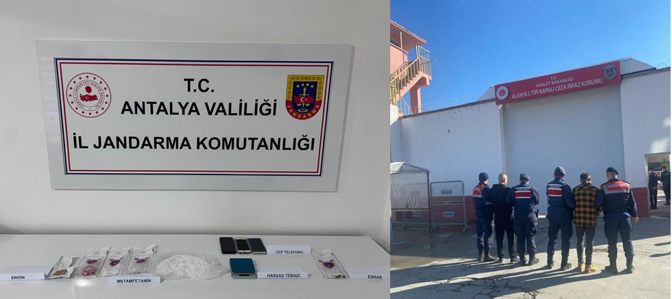 Antalya il Jandarma Komutanlığı KOM.Şb.Md.lüğü ve Alanya İlçe J.K.lığı ekiplerince Alanya ilçesinde Uyuşturucu ve Uyarıcı Madde İmal ve Ticareti, Uyuşturucu Madde Kullanımı ile mücadele kapsamında yapılan çalışmalar neticesinde; (4) şüpheli şahsın uyuşturucu madde ticareti yaptıkları, il dışından getirdikleri Metamfetamin, Eroin ve Esrar maddelerini Alanya ilçesinde piyasaya süreceklerinin tespit edilmesi üzerine Antalya il J.K.lığı KOM Şb.Md.lüğü ile Alanya İlçe J.K.lığı ekiplerince şahısların ikametgahında yapılan adli arama neticesinde;