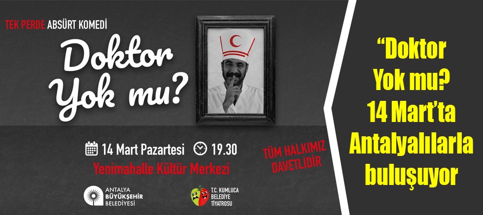 Antalya Büyükşehir Belediyesi’nin katkılarıyla Yenimahalle Kültür Evi’nde 14 Mart Tıp Bayramı’na özel Kumluca Belediye Tiyatrosu’nun “Doktor Yok mu?” isimli oyunu sahnelenecek.