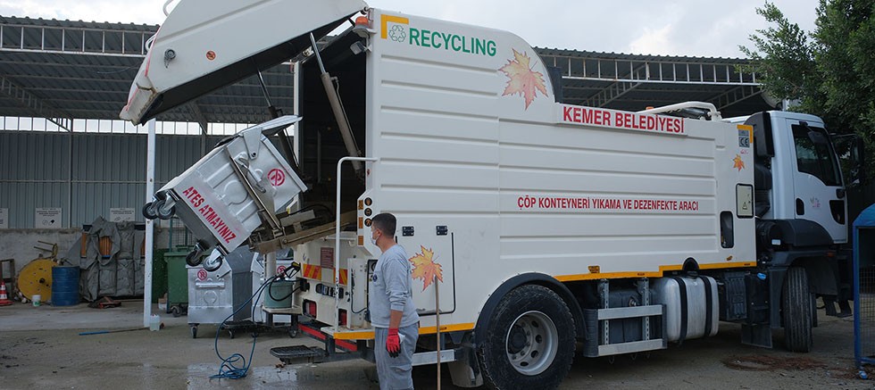 Kemer Belediyesi Temizlik İşleri Müdürlüğü ekipleri, araç filosunda yer alan yıkama ve dezenfekte aracı ile Kemer’deki tüm çöp konteynerlerini yıkayarak dezenfekte ediyor.