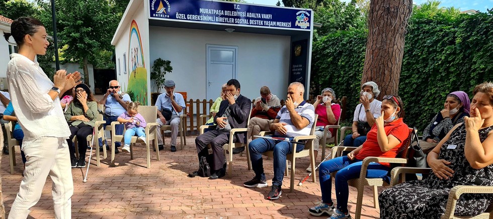 Engelli bireyler ve ailelerine yönelik sosyal destek programları yürüten Muratpaşa Belediyesi Adalya Vakfı Engelsiz Kafe, Beyaz Baston ve Güvenlik Günü’nde, falez sahil bandında çam ağaçlarıyla kaplı bahçesinde nefes terapisi yaptı.