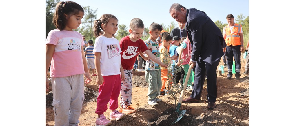 Konuşmaların ardından Başkan Böcek minik çocuklarla marşlar eşliğinde bayrak salladı. Başkan Muhittin Böcek, daha sonra minik çocuklarla birlikte zeytin ve defne fidanlarını toprakla buluşturdu.
