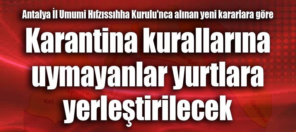 Antalya İl Umumi Hıfzısıhha Kurulu tarafından alınan yeni karara göre izolasyon koşullarını ihlal eden ya da izolasyon koşullarını sağlama imkanı olmayan geçici nitelikte yerlerde konaklayan kişiler, izolasyon süreçlerini yurt ve pansiyonlarda geçirecek.