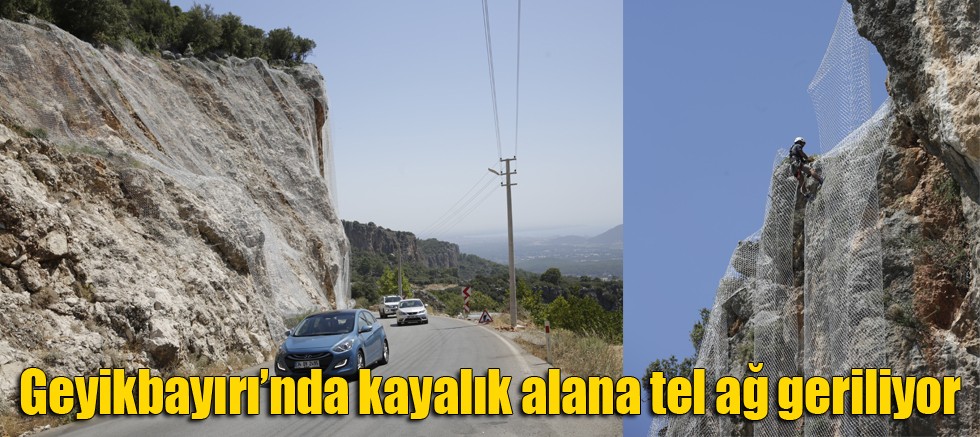 Antalya Büyükşehir Belediyesi, Konyaaltı İlçesi’ne bağlı Geyik Bayırı Mahallesi grup yolunda tehlike arz eden kayalık alana, taş ve toprak düşmelerine karşı çelik ağ çekerek önlem alıyor. Kırsal Hizmetler Dairesi tarafından yürütülen çelik ağ germe işinde, alanında uzaman endüstri dağcıları çalışıyor.