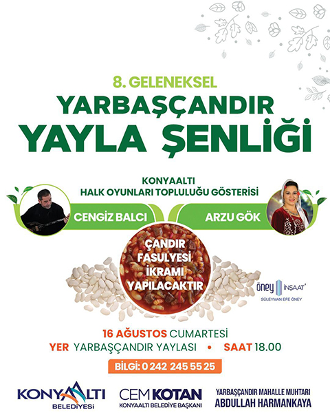 16 Ağustos Cumartesi günü saat 18.00’de Yarbaşçandır Yaylası’nda başlayacak etkinlik, sanatçı Cengiz Balcı, yöresel ezgilerle katılımcılara unutulmaz bir müzik şöleni sunacak. Ardından Konyaaltı Belediyesi Halk Oyunları Topluluğu’nun sahneleyeceği renkli halk dansı gösterisi olacak. Programın sonunda ise sanatçı Arzu Gök sahne alacak. Bölgenin hem ekonomi hem de tanınırlığına katkı sunan ve Meşhur Antalya Piyazı'nın vazgeçilmez lezzeti Çandır fasulyesinden hazırlanmış kuru fasulye yemeği de misafirlere ikram edilecek.