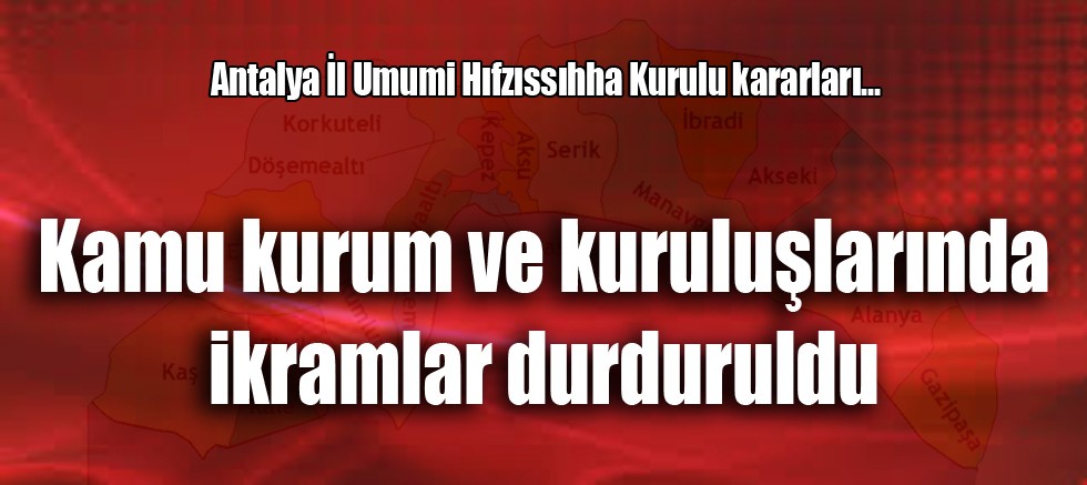 Antalya İl Umumi Hıfzıssıhha Kurulu, "Covid-19 Ek Tedbirler" konulu Genelgesi kapsamında kamu kurum ve kuruluşlarında yemekhane hizmetleri ve paketli su servisi hariç, her türlü yiyecek- içecek ikramının durdurulmasına karar verdi.