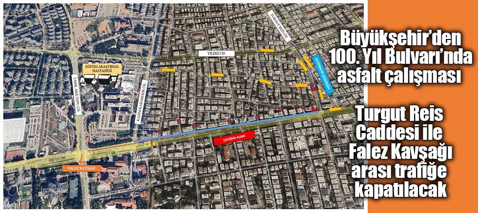 Çalışma kapsamında ilk etapta 100. Yıl Bulvarı’nın şehir merkezinden Konyaaltı istikameti gidiş yönünde Turgut Reis Caddesi ile Falez Kavşağı (Tarık Akıltopu Caddesi) arasında kalan kısmında 14 Aralık Pazar günü saat 07.00 itibariyle yol trafiğe kapatılacak. Yolda yoğun bir çalışma yapılarak, 15 Aralık Pazartesi sabah 06.00’da yolun trafiğe açılması planlanıyor. Yol boyunca devam edecek çalışma süresince sürücülerin, alternatif güzergâhları tercih etmeleri öneriliyor.