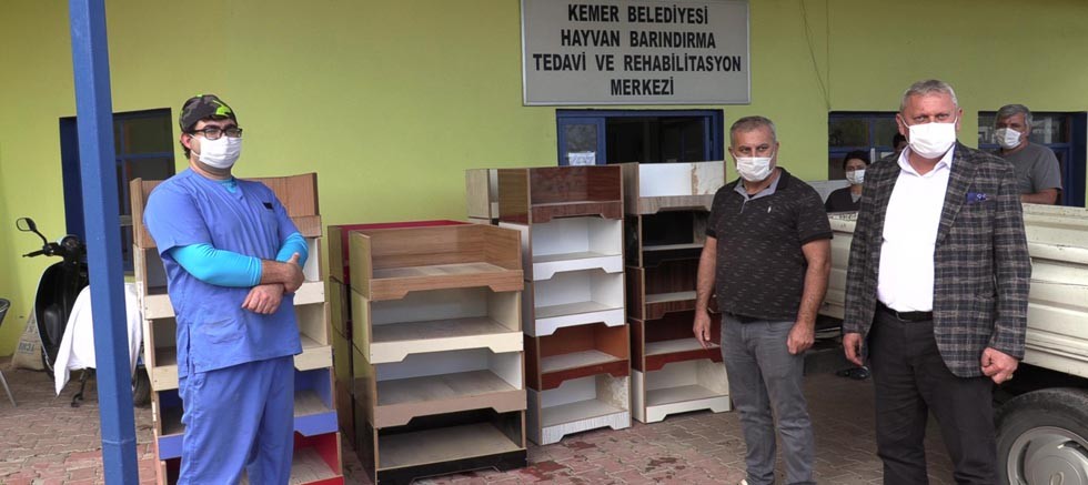Kemer’de mobilyacılık yapan İrfan Örs, Kemer Belediyesi Sağlık İşleri Müdürlüğüne bağlı Hayvan Barındırma tedavi ve Rehabilitasyon Merkezine kendi yaptığı kedi evlerini hediye etti.