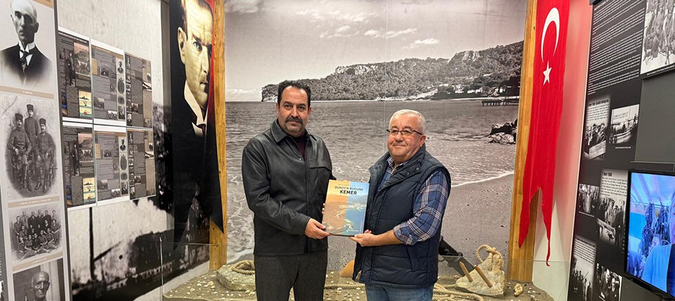 Kemer Belediyesi Kültür Evi Sorumlusu Ramazan Kar, Müdür Arslan’a Kemer tarihini yansıtan fotoğraf ve materyaller hakkında bilgiler verirken Kemer’in tarihini yazdığı “Dünden Bugüne Kemer” kitabını hediye etti.