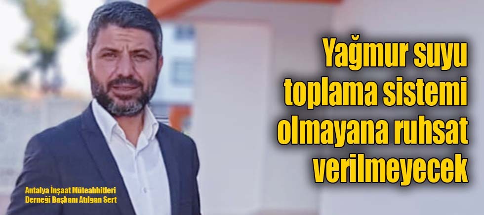 Çevre ve Şehircilik Bakanlığı çatıda toplanan yağmur suyunun bahçe zemini altında bir depoda toplanmasını sağlamak amacıyla yeni binalara “yağmur suyu toplama sistemi” oluşturma zorunluluğu getirdi. Antalya İnşaat Müteahhitleri Derneği Başkanı Atılgan Sert, “Bakan Beyin kararına saygı duyuyor ve kararı destekliyoruz. Gelecek nesillere sağlıklı ve kullanılabilir su kaynağı bırakmak, biz yetişkinlerin en büyük görevlerinden biridir.” dedi.