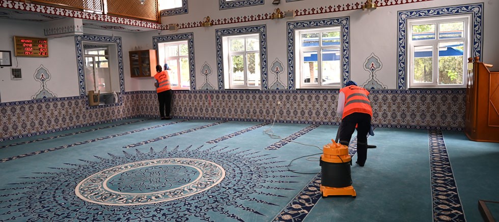 Belediye ekipleri, Kemer'in tüm mahallelerinde bulunan cami ve mescitlerde Ramazan Bayramı öncesinde temizlik yaptı.
