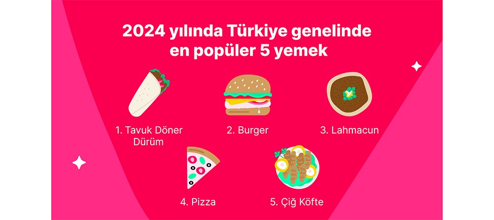 2024 yılında Türkiye genelinde en popüler yemek, Tavuk Döner Dürüm oldu. Global lezzetlerin etkisiyle Burger ve Pizza gibi seçenekler popülerliğini korurken, yerel tatlardan Lahmacun ve Çiğ Köfte de ilk 5'te yer almayı başardı. 2024'te Yemeksepeti'nden en çok sipariş edilen yemekler şunlar oldu: