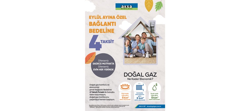 Mutfakta yemek pişirmede tüpe göre 5 kat*, ısınmada ithal kömüre göre 3 kat* ve sıcak suda ise tüpe göre 5 kat* daha ekonomik ve çevreci enerji kaynağı doğal gazı aboneler dilerse evin her yerinde, dilerlerse de yalnızca mutfakta kullanabiliyor. 4 milyonu aşkın aboneye hizmet sunan Aksa Doğalgaz, güçlü altyapısıyla faaliyet gösterdiği tüm kent ve ilçelerde başlattığı bağlantı bedeline 4 taksit kampanyası ile vatandaşları doğal gaz konforuyla buluşturuyor. Doğal gaz konforunun ve ekonomisinin bağlantı bedeline 4 taksit fırsatıyla sunulduğu kampanyadan anlaşmalı banka kredi kartlarıyla yararlanılabiliyor. Yatırımlarını hız kesmeden sürdüren Aksa Doğalgaz, yeni abonelerini de cazip avantajlarla buluşturmaya devam ediyor.