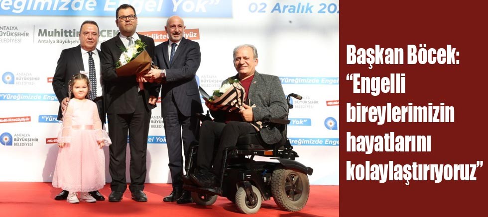 Programda konuşan Büyükşehir Belediye Başkanı Muhittin Böcek, Antalya Büyükşehir Belediyesi olarak, engelli bireylerin, yaşam kalitelerini yükseltmek, sosyal hayata daha aktif katılımlarını sağlamak, sorunlarına daha kolay ve daha hızlı çözüm bulabilmek amacıyla üstlerine düşeni ve daha fazlasını yapma gayretinde olduklarını söyledi. Başkan Böcek, “Türkiye’nin en büyüğü olan Antalya Büyükşehir Belediyemizin Özel Eğitim Okulu ve Rehabilitasyon Merkezimiz, engelli hizmet merkezlerimiz, engelsiz ulaşım araçlarımız, görme engelliler sesli kütüphanemiz, engelsiz plajlarımız, engelli bireylerin evlerinde erişilebilirlik düzenlemeleri çalışmalarımız, engelsiz hizmet komisyonumuz, mola evlerimiz, sosyal yardımlarımız ve son olarak da su tarifelerinde yaptığımız düzenleme ile yüzde 10 olan su indirimini yüzde 40‘a çıkararak sizlere daha çok destek olmaya gayret ediyoruz” dedi.