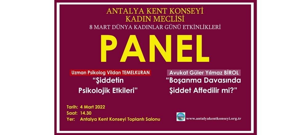 Antalya Kent Konseyi Kadın Meclisi, 8 Mart Dünya Emekçi Kadınlar Günü etkinlikleri kapsamında panel düzenliyor. 4 Mart Cuma günü Kent Konseyi’nde düzenlenecek panelde şiddet ele alınacak.