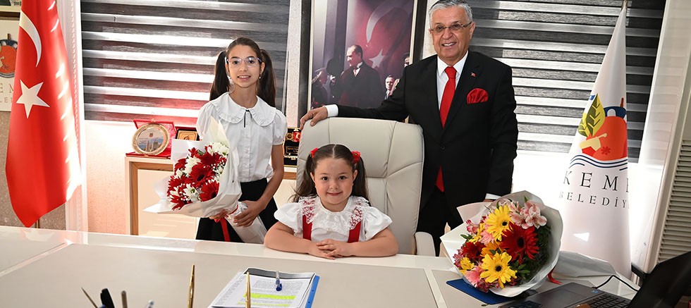 23 Nisan Ulusal Egemenlik ve Çocuk Bayramı nedeniyle Kemer Belediye Başkanı Necati Topaloğlu başkanlık koltuğunu sembolik olarak 1’nci sınıf öğrencisi İkra Ada Kahraman ve 4’ncü sınıf öğrencisi İrem Çelik’e bıraktı.