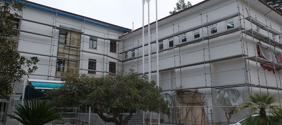 Kemer Belediye binasının iç ve dış cephesinde tadilat çalışmaları son hızla devam ediyor.