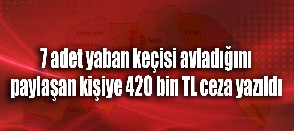 Antalya'da 7 adet yaban keçisi avladığına dair fotoğrafları paylaşan kişiye hayvan başına 60 bin tl olmak üzere toplamda 420 bin lira idari yaptırım cezası uygulandı.
