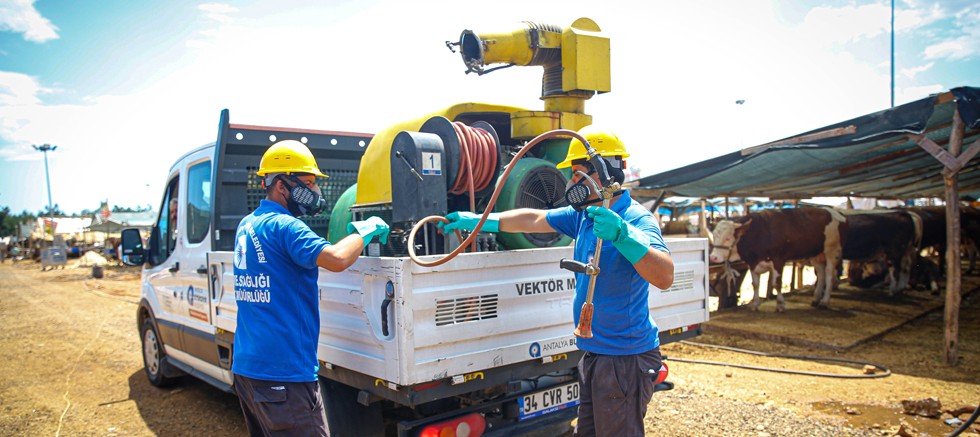 Antalya Büyükşehir Belediyesi, yaklaşan Kurban Bayramı nedeniyle 19 ilçede bulunan kurban satış alanlarında sinek ve haşere üremesine karşı ilaçlama çalışması yapıyor.
