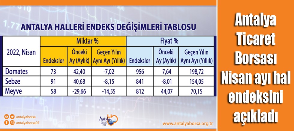 Antalya Ticaret Borsası (ATB), Nisan ayı Antalya Halleri Domates, Sebze ve Meyve Endeksini açıkladı. Antalya hallerinde işlem gören domates, sebze ve meyvelerin işlem miktar ve fiyatlarıyla ilgili endeks değerlerinin değişimleri, 2022 Nisan ayında bir önceki aya göre ve geçen yılın aynı ayına göre aşağıda verilen tablodaki gibi değişti: