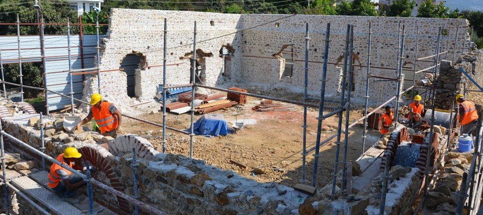 Antalya Büyükşehir Belediyesi, Alanya’nın en önemli tarihi yapılarından biri olan Gülevşen Camii’nin restorasyon çalışmalarına devam ediyor. Büyük bir titizlikle yürütülen çalışmalar kapsamında toprak altında kalan taşlar ortaya çıkarıldı. 2021 yılına kadar ana bina ve şadırvan işinin tamamlanması planlanıyor.