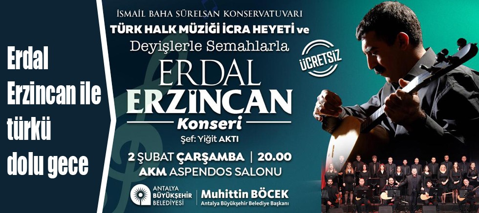 Antalya Büyükşehir Belediyesi Kültür ve Sosyal İşler Dairesi Başkanlığı tarafından düzenlenecek konserde Şef Yiğit Aktı yönetimindeki İsmail Baha Sürelsan Konservatuvarı Türk Halk Müziği İcrâ Heyeti de Erdal Erzincan’a eşlik edecek. Atatürk Kültür Merkezi Aspendos Salonu’nda saat 20.00’de gerçekleşecek, “Deyişlerle Semahlarla Erdal Erzincan Konseri”nde türkü dolu bir gece yaşanacak. Ücretsiz olarak düzenlenecek konsere tüm Antalyalılar davetli.