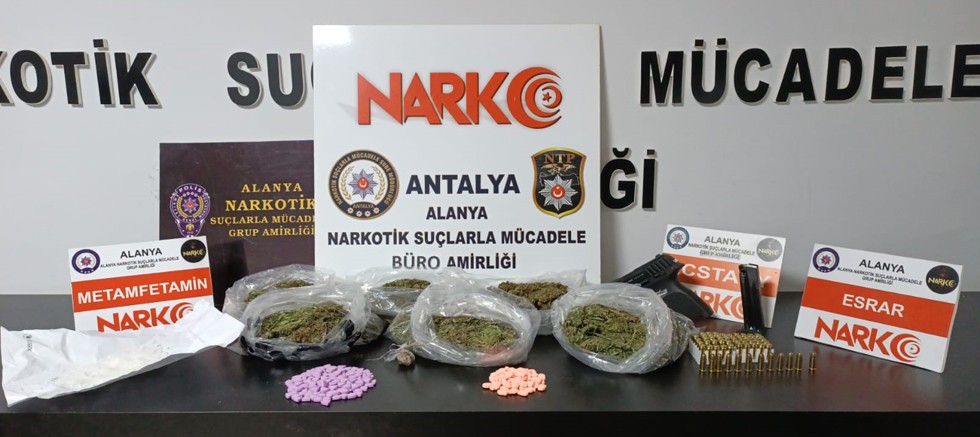 Antalya Valiliği İl Emniyet Müdürlüğü’nce il genelinde uyuşturucu maddelerin kaynağının kurutulması, ticaretinin ve kullanımının engellenmesi amacıyla gerçekleştirilen başarılı operasyonlara bir yenisi daha eklendi. Alanya ilçesinde uyuşturucu madde ticaretinin ve kullanımının engellenmesine yönelik Alanya Cumhuriyet Başsavcılığı koordinesinde, İl Emniyet Müdürlüğü birimlerince 9 Kasım 2022 günü yapılan çalışmalar sonucunda, şüphe üzerine durdurulan bir araçta uyuşturucu madde ve silah yakalandı.