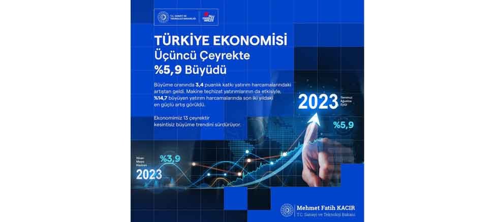 Bakan Kacır, sosyal medya hesabından yaptığı açıklamada, “Türkiye ekonomisi; Temmuz, Ağustos ve Eylül aylarını kapsayan 2023 yılının üçüncü çeyreğinde %5,9 oranında büyüme kaydetti.