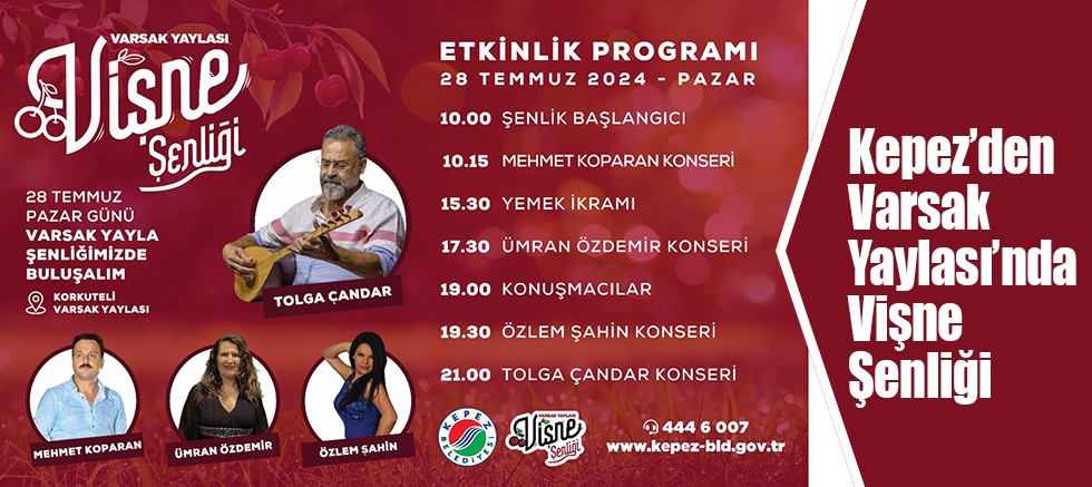 Kepez Belediye Başkanı Mesut Kocagöz’ün, seçim döneminde vaat ettiği 107 proje arasında yer alan kültür ve sanat etkinlikleri, Vişne Şenliği ile başlıyor. Kepez Belediyesi, Varsak bölgesindeki 11 mahalle sakinini yaz döneminde göç ettikleri Varsak Yaylası’nda düzenlenecek Vişne Şenliği’nde buluşturuyor. Korkuteli-Tefenni yolu üzerinde, 1400 metre rakımda bulunan Varsak Yaylası’ndaki şenlikler, 28 Temmuz Pazar günü gerçekleştirilecek. Gün boyu devam edecek şenliklerde, halk müziği sanatçıları, Tolga Çandar, Özlem Şahin, Mehmet Koparan ve Ümran Özdemir sahne alacak. Yerel üreticilerin yaylanın en güzel vişnelerini sergileyeceği şenliklere çeşitli etkinlikler de renk katacak. Şenlikler, hem yerel üreticileri bir araya getirirken hem de Antalyalıları şehrin sıcak ve nemli havasından uzaklaştıracak.
