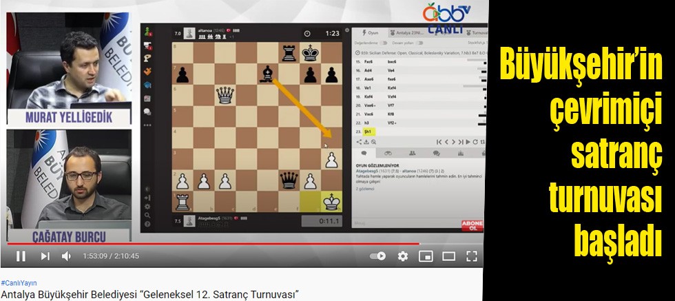 Her akşam saat 19.00’da çevrimiçi olarak devam eden turnuvanın ilk gününde milli antrenör FİDE Eğitmeni Murat Yelligedik ve Çağatay Burcu da canlı maç anlatımıyla turnuvaya ayrı bir heyecan kattı. 29 Nisan’a kadar devam edecek turnuva sonunda Büyükşehir Belediyesi tarafından her kategoride dereceye giren sporculara kupa, madalya, bisiklet, tablet ve akıllı kol saati gibi çeşitli hediyeler verilecek. 12. Geleneksel Satranç Turnuvası açılışında olduğu gibi kapanış bölümü de ABB sosyal medya hesaplarından canlı olarak izlenebilecek.