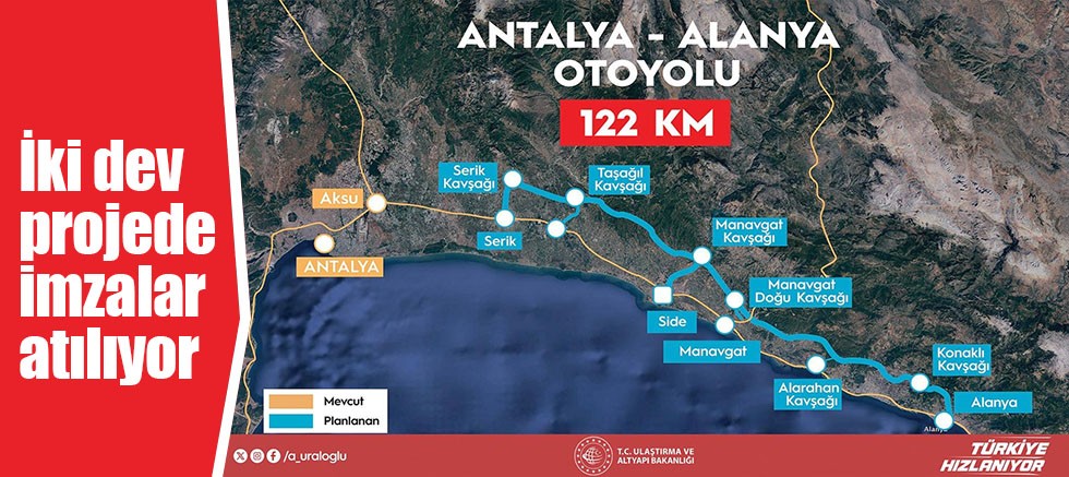 Ulaştırma ve Altyapı Bakanı Abdulkadir Uraloğlu, Ankara-Kırıkkale-Delice ve Antalya-Alanya Otoyolu projelerine 2024 yılı bitmeden başlayacaklarını açıkladı. İki projenin sözleşme tarihlerinin belli olduğunu duyuran Bakan Uraloğlu, “Ankara-Kırıkkale-Delice ve Antalya-Alanya otoyollarının proje yapım sözleşmelerini 14 Ekim Pazartesi günü imzalayacağız. Sözleşme imzalanmasını takiben yer teslimi yapılacak ve yıl sonuna kadar yapım çalışmaları başlayacak.” dedi.